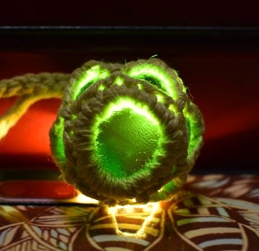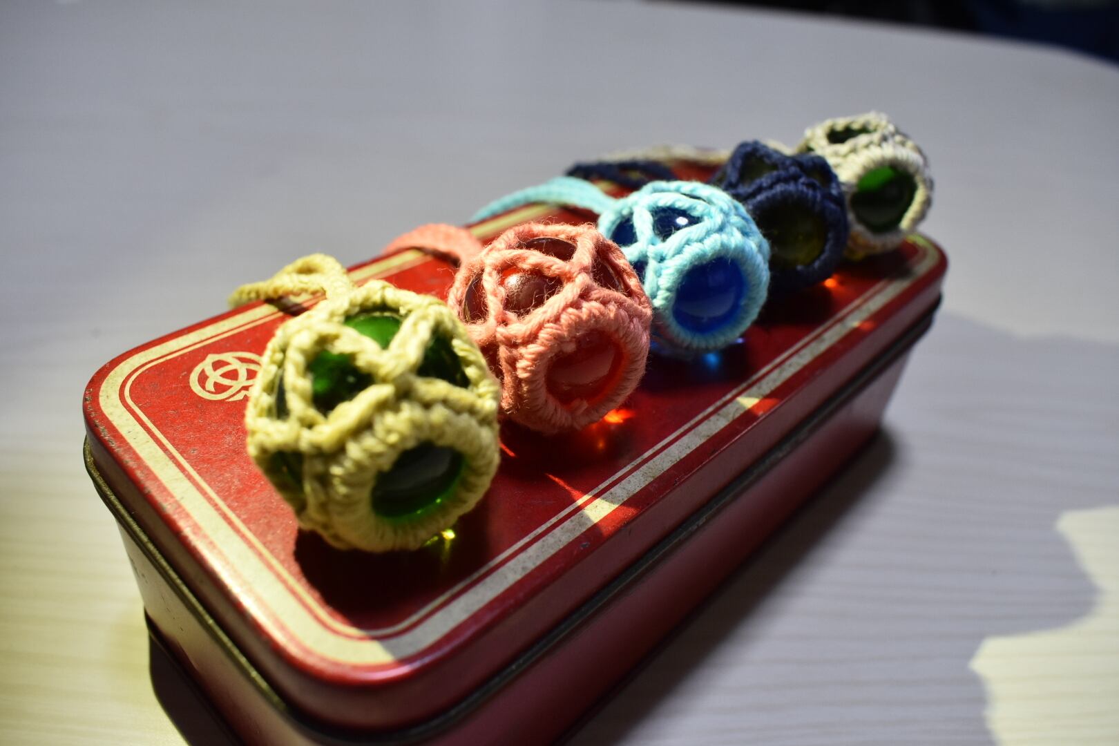 細いリネン糸や綿糸で大きめのガラス玉を編み包みました。